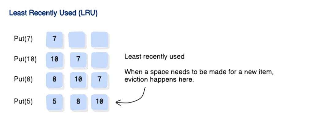 Ele remove os itens menos acessados recentemente para liberar espaço, garantindo que apenas os “quentes” permaneçam.